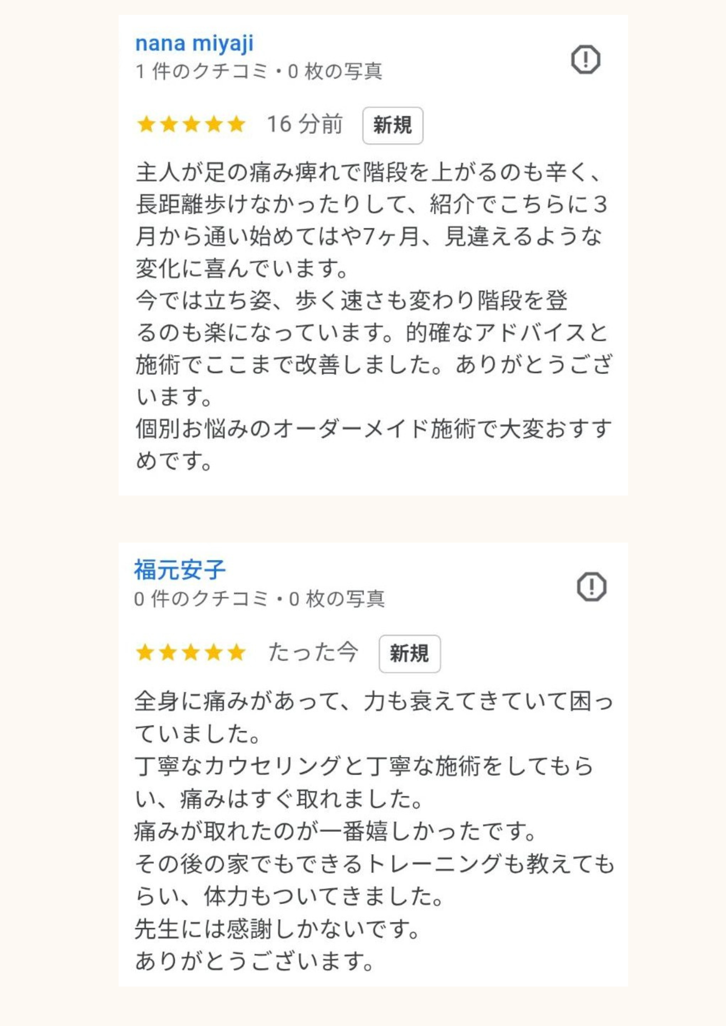 初回来院後や運動療法を体験された感想などをお答えいただいています(^^)